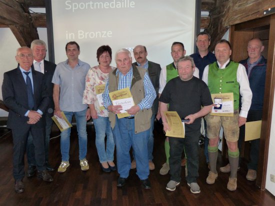 Mit der Verdienstmedaille in Bronze mit Anstecknadel und Urkunde für Verdienste um den Sport wurden ausgezeichnet: Helga Herreiner vom SV Sallach. Sie war von 2008 bis 2012 Schriftführerin in der Tennisabteilung und seit 2013 bis heute Kassenführerin in der Fußballateilung. Roland Dallmeier, seit über 10 Jahren zuerst stellvertretender, dann 1. Abteilungsleiter Fußball und zugleich Tennistrainer beim ETSV Hainsbach. Christian Plank seit über 10 Jahren Platz- und Zeugwart für die Fußballabteilung des ETSV Hainsbach. Johann Scherzer, seit über 10 Jahren stellvertr. Abteilungsleiter und Zeugwart in der Eisstockabteilung des ETSV Hainsbach. Die gleiche Auszeichnung hätten erhalten, waren aber leider nicht anwesend, Robert Wastl, seit 15 Jahren Sportleiter der Kgl. Priv. Feuerschützengesellschaft 1590 Geiselhöring, Josef Speiseder sen. seit über 10 Jahren Kassier bei den Stockschützen des SV Sallach, sowie Reinhold Apfel, seit über 10 Jahren Jugendtrainer beim SV Sallach.